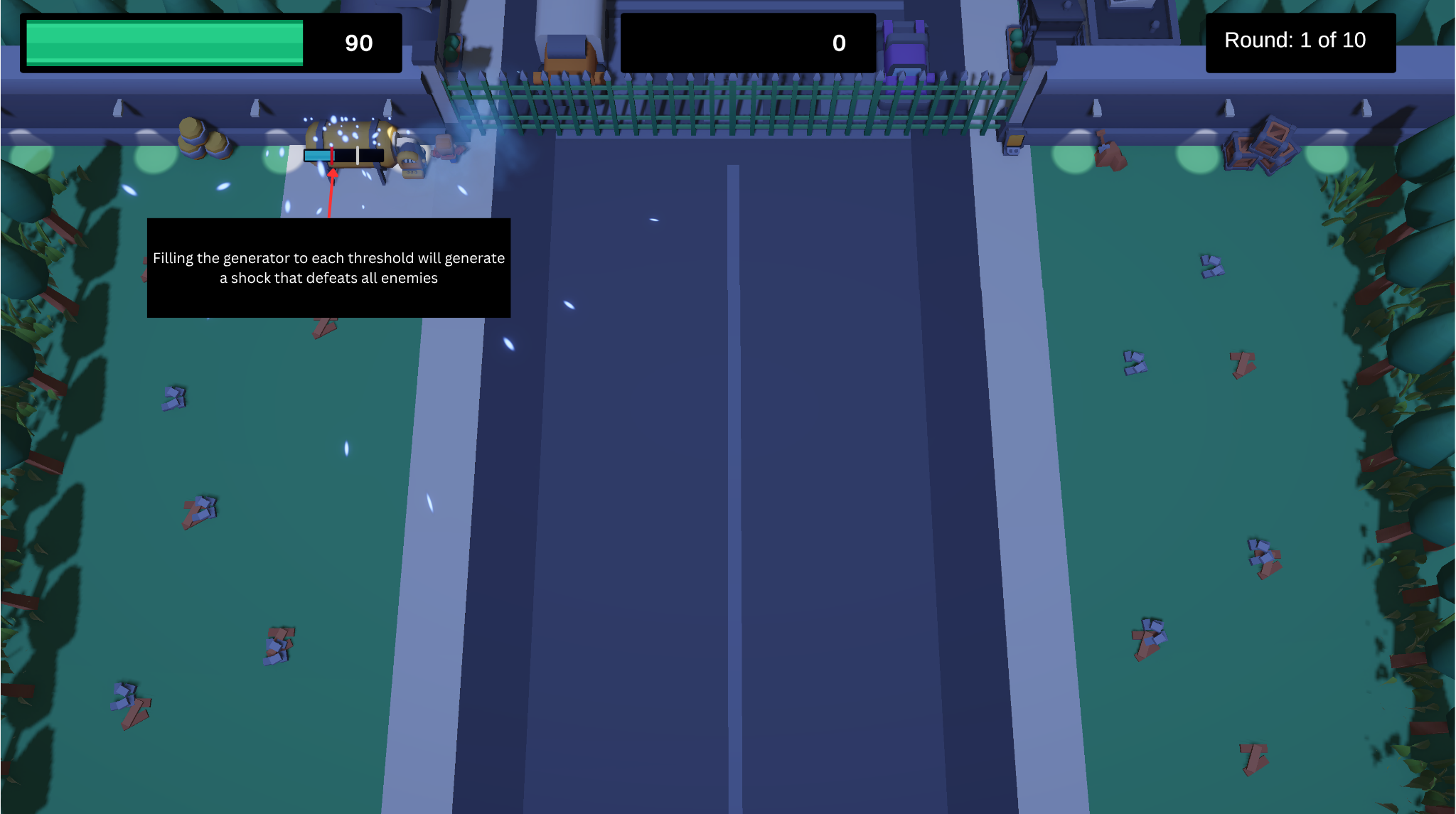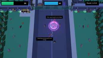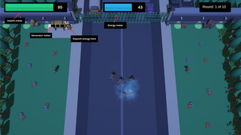 2) Each round starts you with 10 energy, and you can hold a maximum of 50. As long as you have some energy, your shock aura will be active. Being near enemies while your shock aura is active will damage them over time until they are defeated. Defeating an enemy will grant you 5 energy.