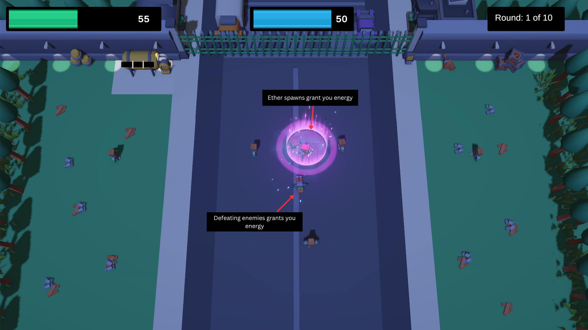 3) Ether will spawn every 10 seconds. Each spawn will last 3 seconds. If you are within the Ether spawn at the end of the 3 seconds, you will gain 20 energy. The timer for the next Ether spawn starts when the current Ether spawn disappears.